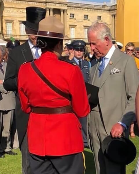 En 2018, j'ai été choisie pour faire partie d'un contingent de la Division D (Manitoba) pour assister aux célébrations du 70e anniversaire de Sa Majesté le roi Charles III (alors prince de Galles) dans les jardins du palais de Buckingham. Je représentais la GRC en compagnie de deux autres policiers et de deux employés civils. J'ai alors eu l'occasion d'offrir au Prince des mocassins faits à la main par Edna Nabess, membre de ma famille élargie de la Nation crie de Mathias Colomb. Ce présent m'a permis de mettre en valeur mes origines et d'exprimer ma gratitude pour l'honneur de cette rencontre. J'ai aussi pu m'entretenir brièvement avec lui et lui expliquer la nature de ce présent et son importance. Si je n'étais pas devenue membre de la GRC, je doute fort que j'aurais eu une telle possibilité.
