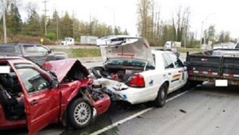 La voiture rouge endommagée a embouti l’arrière d’une auto-patrouille de la GRC, en bordure de route.
