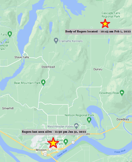 Mme Rogers a été vue pour la dernière fois à pied, quittant sa résidence située à l’angle de la rue Grand et de la 6th Avenue à Mission, vers 23 h 30 le 31 janvier 2022. Son corps a été découvert le lendemain matin à environ 22 km de là, dans le parc régional de Cascade Falls.