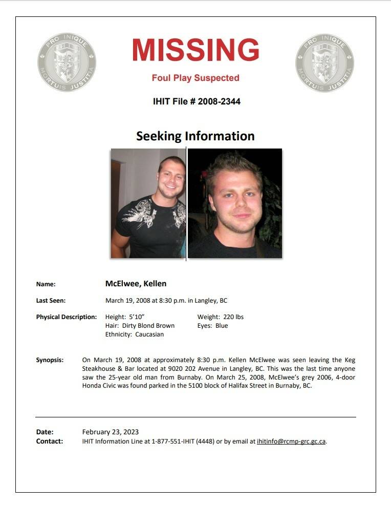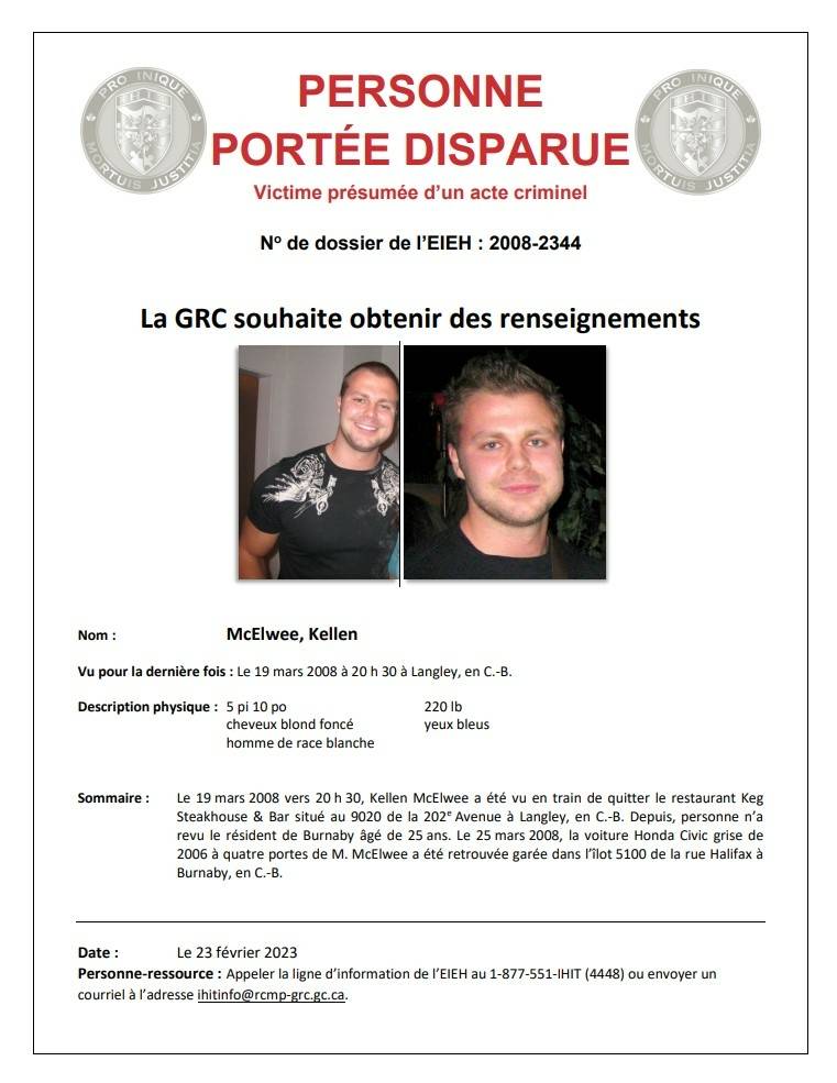 Le 19 mars 2008, vers 20 h 30. Kellen McElwee a été aperçu alors qu’il quittait le Keg Steakhouse & Bar situé au 9020, 202e Rue à Langley, en Colombie-Britannique. C’est la dernière fois que l’homme de Burnaby, âgé de 25 ans, a été aperçu. Le 25 mars 2008, la Honda Civic 4 portes grise de 2006 de M. McElwee a été retrouvée garée dans le pâté de maisons 5100 de la rue Halifax à Burnaby, en Colombie-Britannique. Le 22 avril 2008, après avoir consulté le Groupe des crimes graves du Détachement de la GRC de Burnaby, l’Équipe intégrée d’enquête sur les homicides (EIEH) s’est saisie de l’enquête sur la disparition.