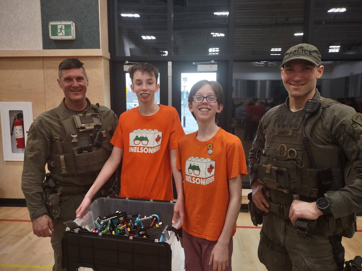 Après avoir remporté la première place à l’événement régional organisé à l’école HMS, les « Nelson Nerds », équipe composée d’Eric Bibby et de Kasper Breisnes que l’on voit ici en compagnie des gendarmes de la GRC, ont ensuite décroché le titre de champions lors de la compétition C.-B./Yukon le 8 mars, ce qui leur a assuré une place à la finale nationale qui se tiendra plus tard cette année.