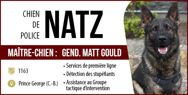 Chaque mois, la GRC en C.-B. met en vedette un chien ou une chienne de police travaillant dans la province, notamment au sein des Services cynophiles intégrés du District du Lower Mainland, lesquels comprennent des partenaires des services de police d’Abbotsford, de Delta, de New Westminster, de Port Moody et de West Vancouver.