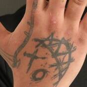 - divers tatouages sur la main droite;