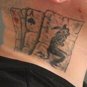 - tatouage de cartes représentant le joker, l’as de pique et le roi de cœur sur le côté droit du cou;