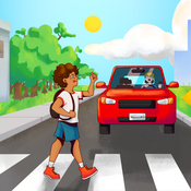 [L’élève arrive à un passage pour piétons et regarde des deux côtés avant de traverser.]