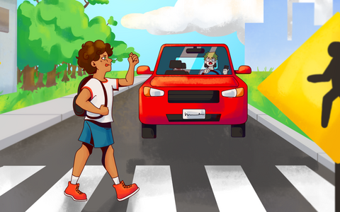 [Alors que l’élève traverse la route, nous voyons une voiture foncer sur lui. L’élève claque des doigts.]