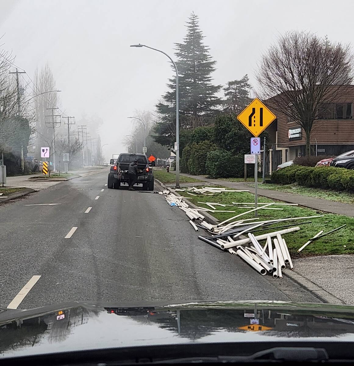 Dans un autre incident, un chargement de tuyaux en PVC non arrimés s’est renversé sur le No. 5 Road depuis l’arrière d’une camionnette, obligeant les agents à bloquer brièvement la circulation pendant que le conducteur dégageait la chaussée et arrimait son chargement, avant de recevoir une contravention pour avoir conduit un véhicule non commercial avec un chargement non arrimé.