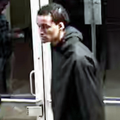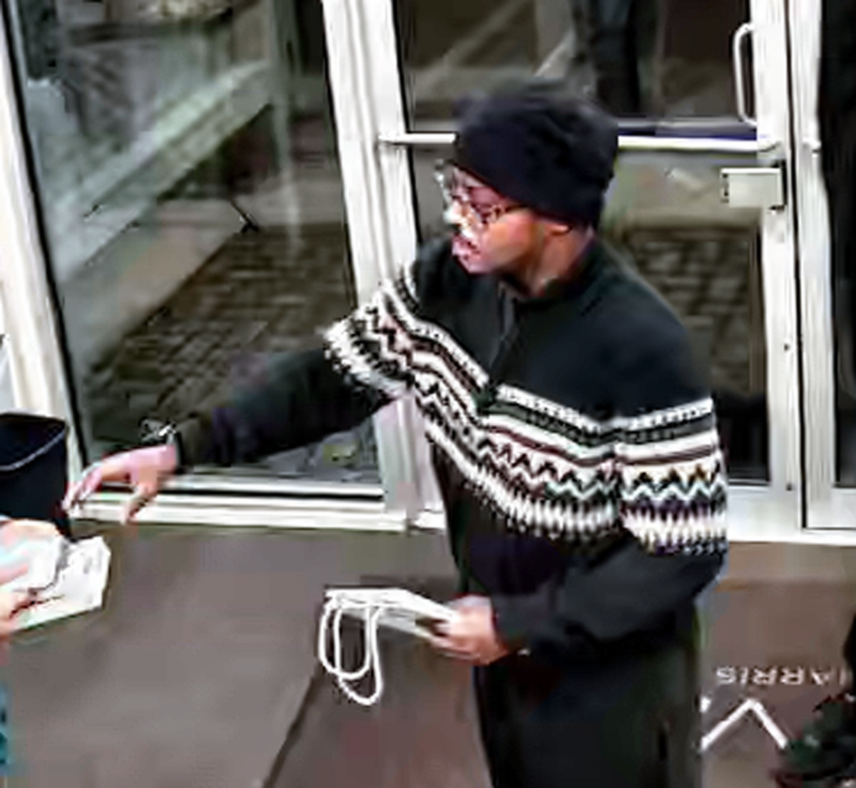 - Il portait des lunettes, une tuque foncée et un chandail noir avec des marques blanches.