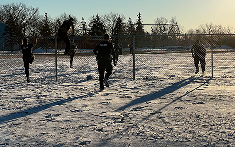 La course en uniforme est un jalon exaltant de la formation. Vêtus de leur équipement tactique, y compris leur gilet pare-balles souple, les cadets courent sur toutes sortes de terrains et affrontent de nombreux obstacles. Cette activité simule le type de course qu'ils devront peut-être faire dans le cadre de leurs fonctions sur le terrain.