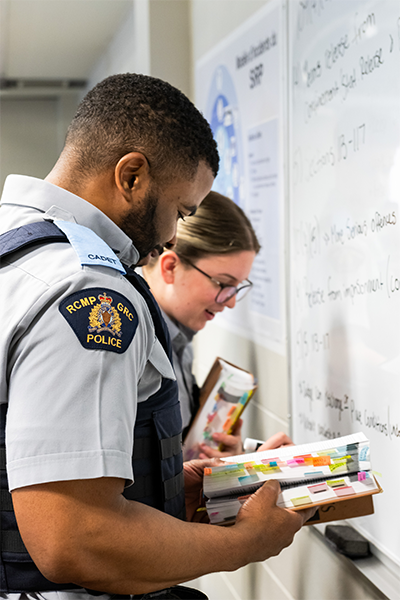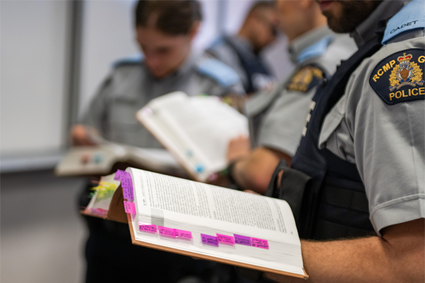 Aujourd’hui à Mardi formation, nous parlons d’un élément central des études des cadets à l’École de la GRC : le Code criminel. À titre de futurs policiers, il est important que les cadets de la GRC aient une compréhension solide du Code criminel et de ses applications à leur travail. C’est pendant les cours des Sciences policières appliquées (SPA) du Programme de formation des cadets que les cadets font cet apprentissage. Les cours des SPA se donnent en classe et forment la partie théorique du programme où les cadets apprennent l’application des lois canadiennes.