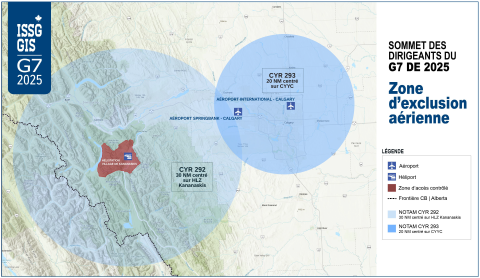 - À titre d'organisme responsable du Groupe intégré de la sécurité (GIS) pour le Sommet du G7 de 2025, la GRC diffusera un NOTAM (avis aux aviateurs) concernant les restrictions temporaires de l'espace aérien au-dessus de Calgary et de Kananaskis (Alberta), qui seront en vigueur du 14 juin, à 6 h, au 17 juin, à 23 h 59 (heure locale).