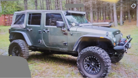 Le véhicule est un Jeep TJ vert de 2007. Il porte la plaque d’immatriculation du Nouveau-Brunswick GPU 832 et le numéro d’identification de véhicule 1J4GA39177L112533. Contrairement à la photo, au moment du vol, le toit du Jeep était rigide, de couleur noire, et le VUS avait des pneus d’hiver sur des jantes de couleur argentée.