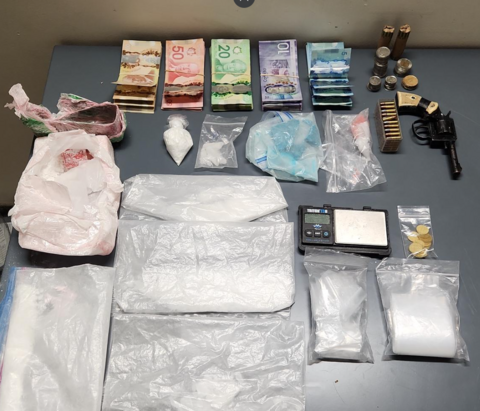 Après les arrestations, la police a fouillé le véhicule et a trouvé des substances que l’on croit être de la cocaïne, de la méthamphétamine en cristaux et du fentanyl, une importante quantité de billets de banque canadiens, une arme à feu prohibée et des munitions.