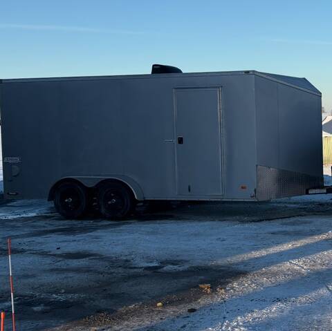 La remorque est une remorque fermée grise Bravo SC71 de 2021. Elle porte la plaque du Nouveau‑Brunswick TVU 878 et le numéro d’identification de véhicule 542BC1624MB035931.
