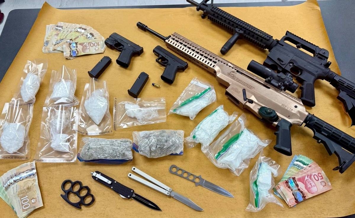 Au cours des perquisitions, les membres de la GRC ont saisi deux armes de poing de 9 mm chargées, dont une sans numéro de série, ainsi que 10 armes d'épaule, des couteaux à ouverture automatique, de la cocaïne, de la MDMA et des objets associés aux drogues.