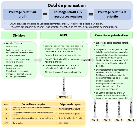 Il offre aux cadres divisionnaires une méthode structurée pour évaluer leurs projets d'enquête et orienter leurs efforts vers les activités de la PF qui sont les plus prioritaires dans leur division. Le Groupe de l'évaluation de la PF (GEPF), qui relève de la Gestion de l'information opérationnelle de la PF (GIOPF), appuie le travail du Comité permanent sur la priorisation et la gouvernance des projets majeurs de la PF à la Direction générale (le Comité de priorisation) et le cycle d'établissement des priorités pour tous les projets d'envergure. Le Comité de priorisation veille à ce que les projets majeurs de la PF soient consacrés aux menaces criminelles qui portent le plus grand préjudice au Canada. Le processus relatif à l'Outil de priorisation est résumé dans la figure 1.
