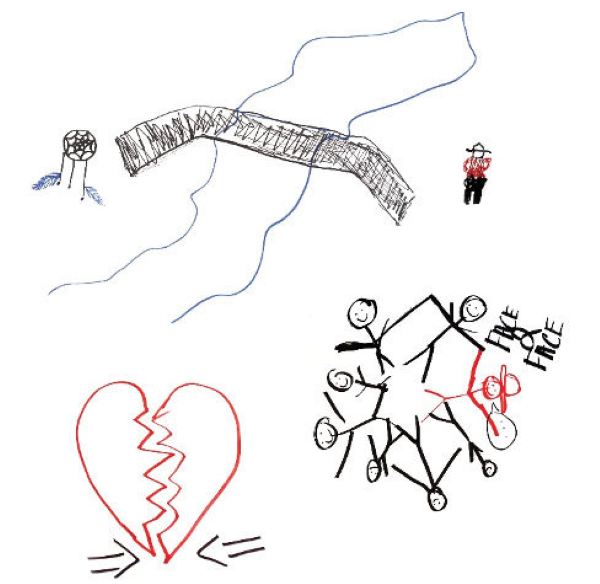 - Une rivière qui coule sous un pont; sur une rive se trouve un policier de la GRC et sur l'autre, un capteur de rêves.
