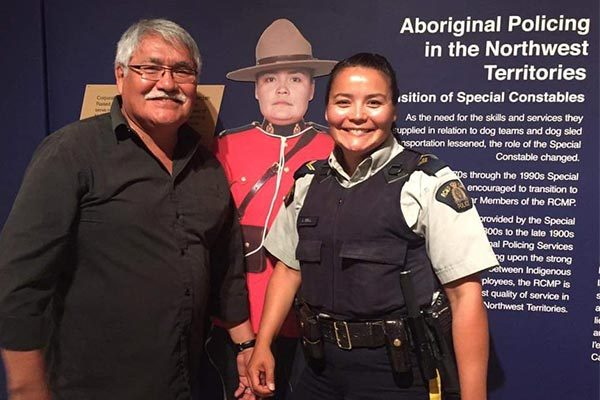 La caporale April Bell et l'aîné Paul Andrew des Territoires du Nord-Ouest (Division G) se sont rendus dans différentes collectivités pour interviewer les gendarmes spéciaux et leur famille au sujet de leur service dans les Territoires du Nord-Ouest. Leurs histoires et leurs récits font maintenant partie de l'exposition « Nous avons pris soin d'eux : Les gendarmes spéciaux des TNO » au Centre du patrimoine septentrional Prince-des-Galles de Yellowknife. Cette exposition a récemment remporté le Prix culturel de l'Association des musées canadiens. Il y a une exposition jumelle virtuelle sur le site Web du Centre du patrimoine septentrional Prince-des-Galles.Note de bas de page 7 L'exposition est présentée dans 11 langues.