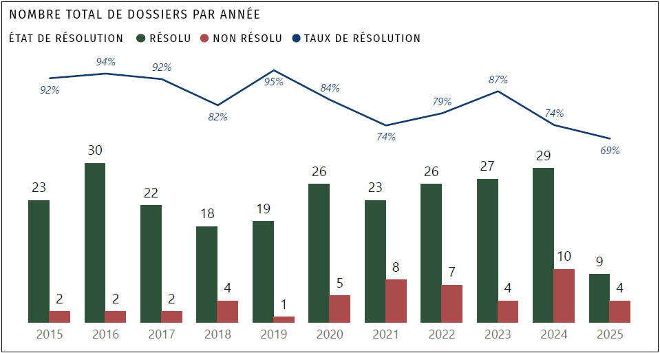 - 2025 jusqu’au 15 juillet : 13 dossiers d’homicide ayant fait 13 victimes.