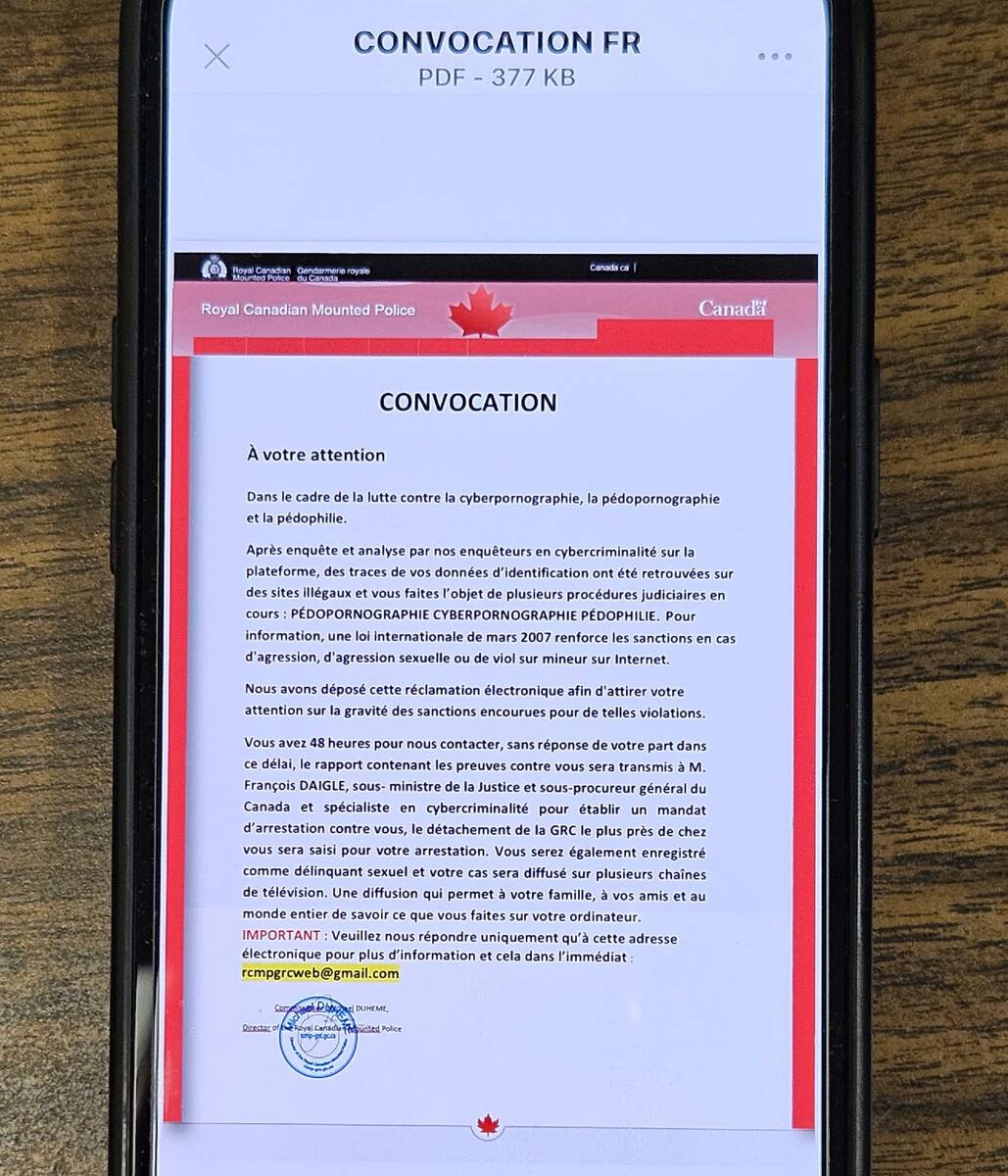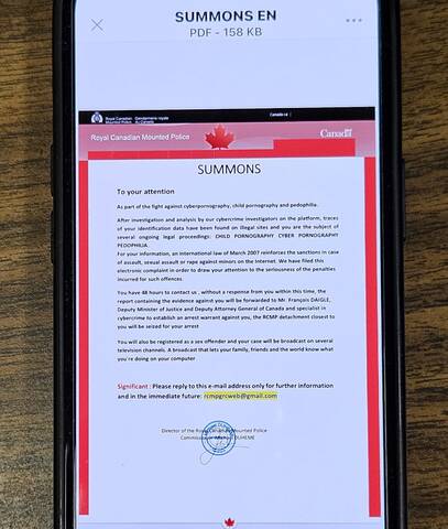 La GRC rappelle qu’il s'agit d’une tentative d’extorsion qui figure sur le site du Centre antifraude du Canada : https://centreantifraude.ca/scams-fraudes/extortion-extorsion-fra.htm#a0.