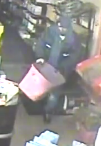 Sur les images de vidéosurveillance, on aperçoit le suspect portant une tuque et un chandail à capuchon foncés, ainsi qu’une veste bleu foncé avec bande réfléchissante horizontale.