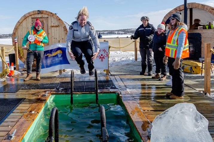 Lors du Plongeon en eaux glacées de cette année à Whitehorse, des agents de la GRC du Yukon et des membres de la communauté locale ont accepté de s'immerger dans une énorme benne remplie d'eau par une journée exceptionnellement froide de -11°C.