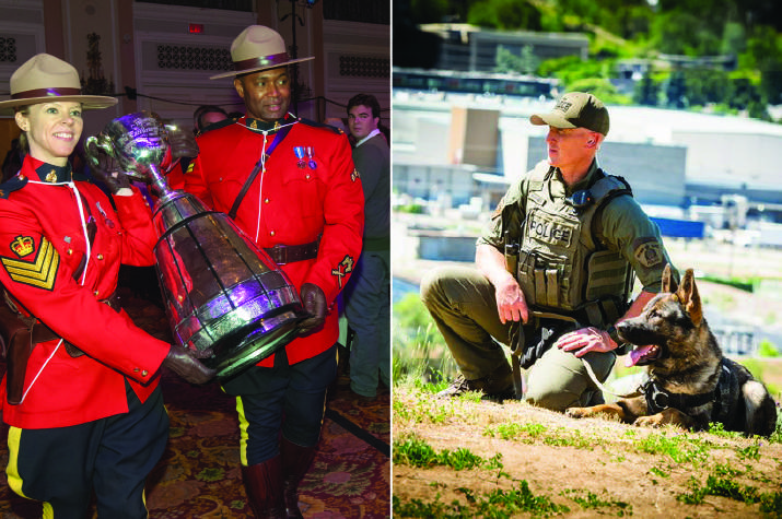 Des images de moments marquants de leur carrière à la GRC : le sergent d’état-major Walcott portant la Coupe Grey avec la surintendante principale Lesley Ahara, et le gendarme Wagner prenant la pose aux côtés de son chien de police.