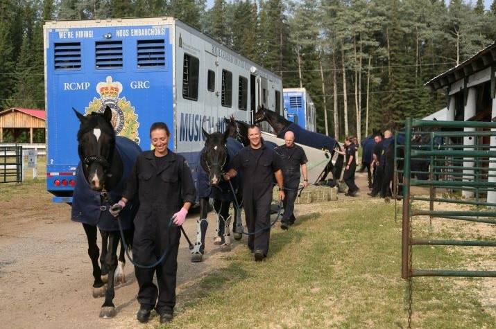 Il faut quatre camions gros porteurs de 22 mètres de long pour transporter les chevaux et l'équipement des écuries de la GRC d'Ottawa jusqu'à destination. Trois remorques transportent douze chevaux chacune, et la quatrième, tous les accessoires, les outils et l'équipement, dont les effets et uniformes des cavaliers. Ceux-ci voyagent en autobus ou en avion, selon la distance à parcourir. Les déplacements outre-mer des chevaux se font par avion-cargo.