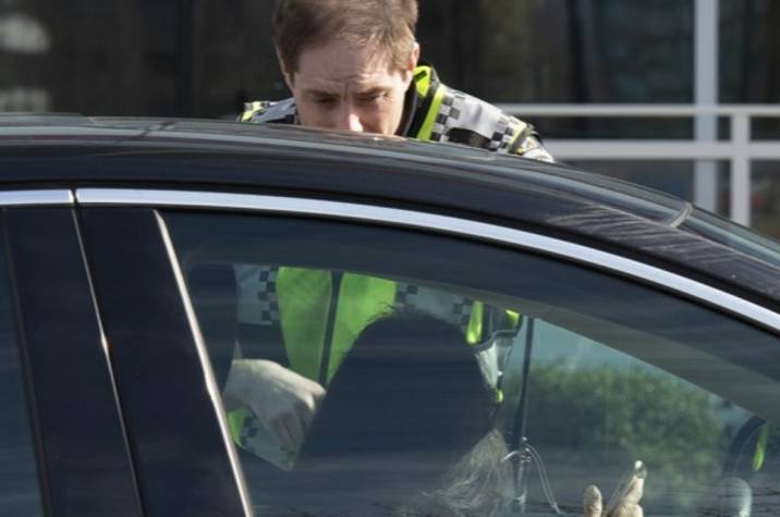 L'agent Steve Shaw, membre du Groupe intégré de la sécurité routière du district du Lower Mainland, intercepte une automobiliste à Burnaby (Colombie-Britannique). Elle recevra une amende pour distraction au volant.