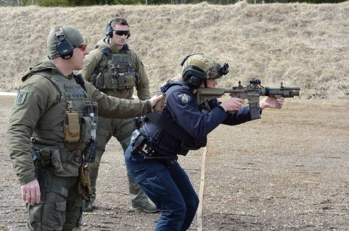 Le gendarme Andrew MacLellan chronomètre la gendarme Kristen Carroll pendant un exercice de tir à une séance sur le GTI à l’intention des policières à Cole Harbour, Nouvelle-Écosse.