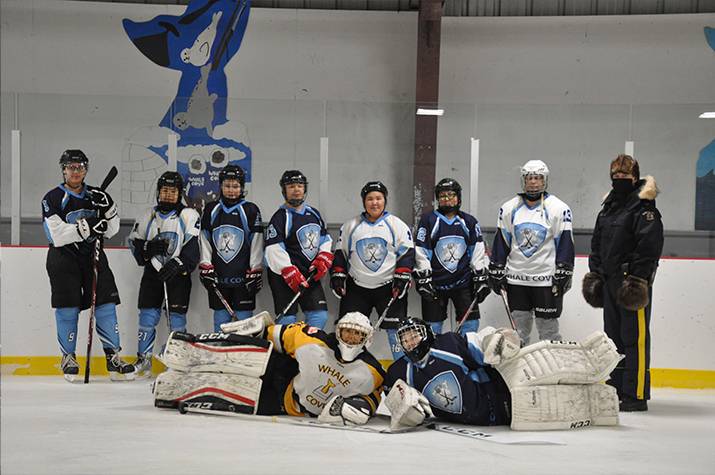 Les membres de l'équipe de hockey féminine de Whale Cove, au Nunavut, portent fièrement un nouveau chandail obtenu grâce au soutien de la GRC.